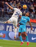 Чемпионат России по футболу среди клубов Премьер-лиги. 13-й тур. Матч между командами "Зенит" (Санкт-Петербург) и "Динамо" (Москва) на стадионе "Газпром Арена". Игрок команды "Зенит" Артем Дзюба (слева) во время матча.