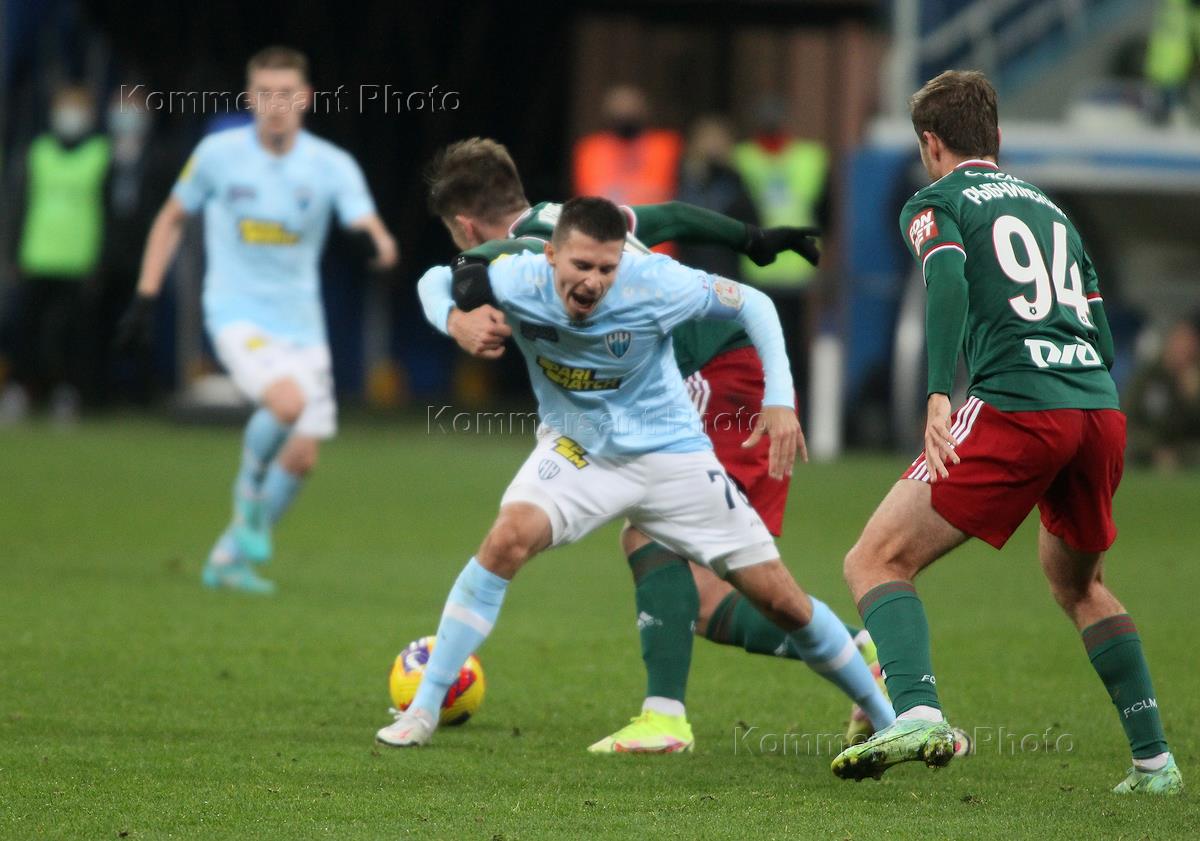Russian Premier League (RPL). Tinkoff - Russian Football Championship 2021/2022. 13th round. A match between the teams Nizhny Novgorod (Nizhny Novgorod) and Lokomotiv (Moscow) at the Nizhny Novgorod stadium. Lokomotiv player Vitaly Lisakovich (right) during the match.