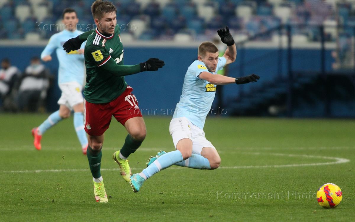 Российская Премьер-Лига (РПЛ). Тинькофф - Чемпионат России по футболу 2021/2022. 13-й тур. Матч между командами "Нижний Новгород" (Нижний Новгород) и "Локомотив" (Москва) на стадионе "Нижний Новгород". Игрок команды "Локомотив" Виталий Лисакович (справа) во время матча.