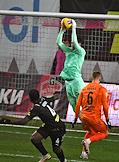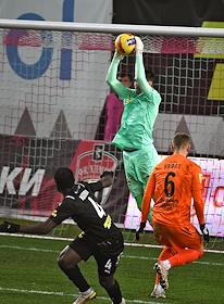 Российская Премьер-Лига (РПЛ). Тинькофф - Чемпионат России по футболу 2021/2022. 13-й тур. Матч между командами "Химки" (Химки) - "Урал" (Екатеринбург) на стадионе "Арена Химки". Вратарь команды "Химки" Илья Лантратов (в центре) во время матча.
