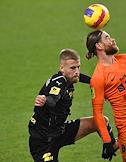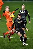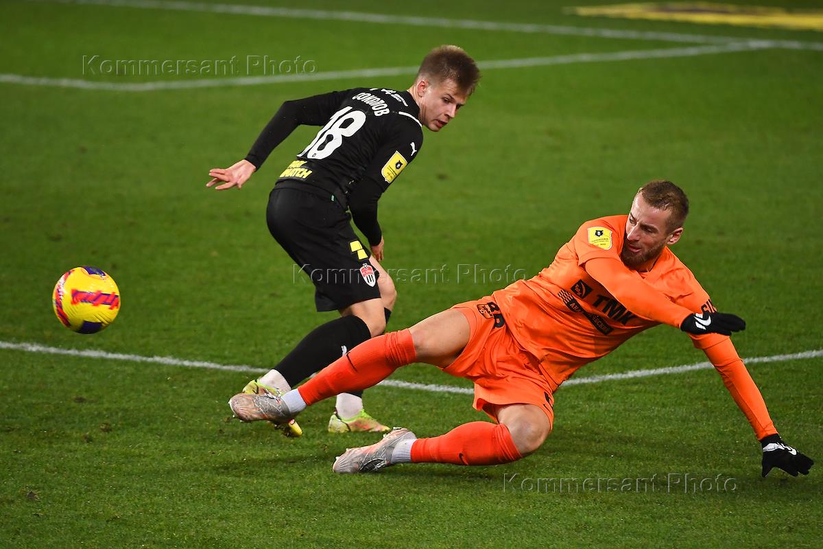 Российская Премьер-Лига (РПЛ). Тинькофф - Чемпионат России по футболу 2021/2022. 13-й тур. Матч между командами "Химки" (Химки) - "Урал" (Екатеринбург) на стадионе "Арена Химки". Вратарь команды "Химки" Илья Лантратов (справа) во время матча.