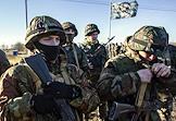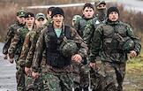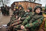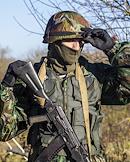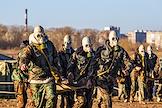 Молодежный военно-патриотический слет, посвященный 80-й годовщине подвига Зиновия Колобанова, в поселке Виллози. Участники слета во время марш-броска в противогазе.