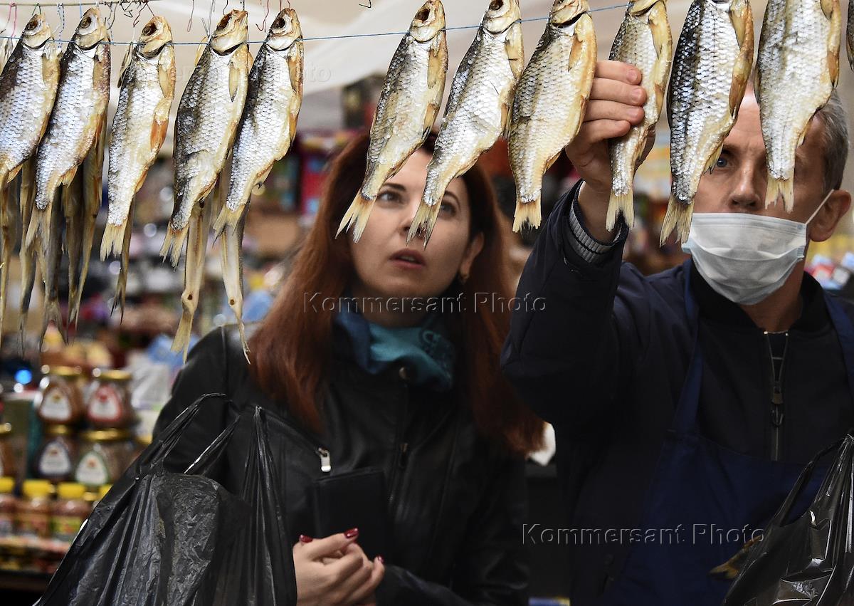Ялта во время ограничительных мер против распространения коронавирусной инфекции COVID-19. Жанровая фотография. Торговля вяленой рыбой на рынке.