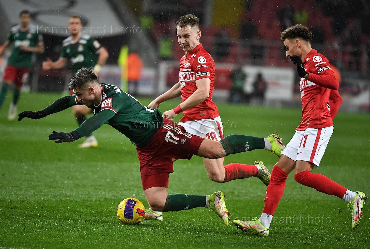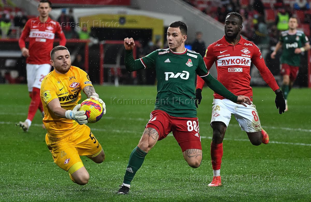 Российская Премьер-Лига (РПЛ). Тинькофф - Чемпионат России по футболу 2021/2022. 14-й тур. Матч между командами "Спартак" (Москва) - "Локомотив" (Москва) на стадионе "Открытие Арена". Слева направо: вратарь команды "Спартак" Александр Селихов, игрок команды "Локомотив" Виталий Лисакович и игрок команды "Спартак" Виктор Мозес во время матча.