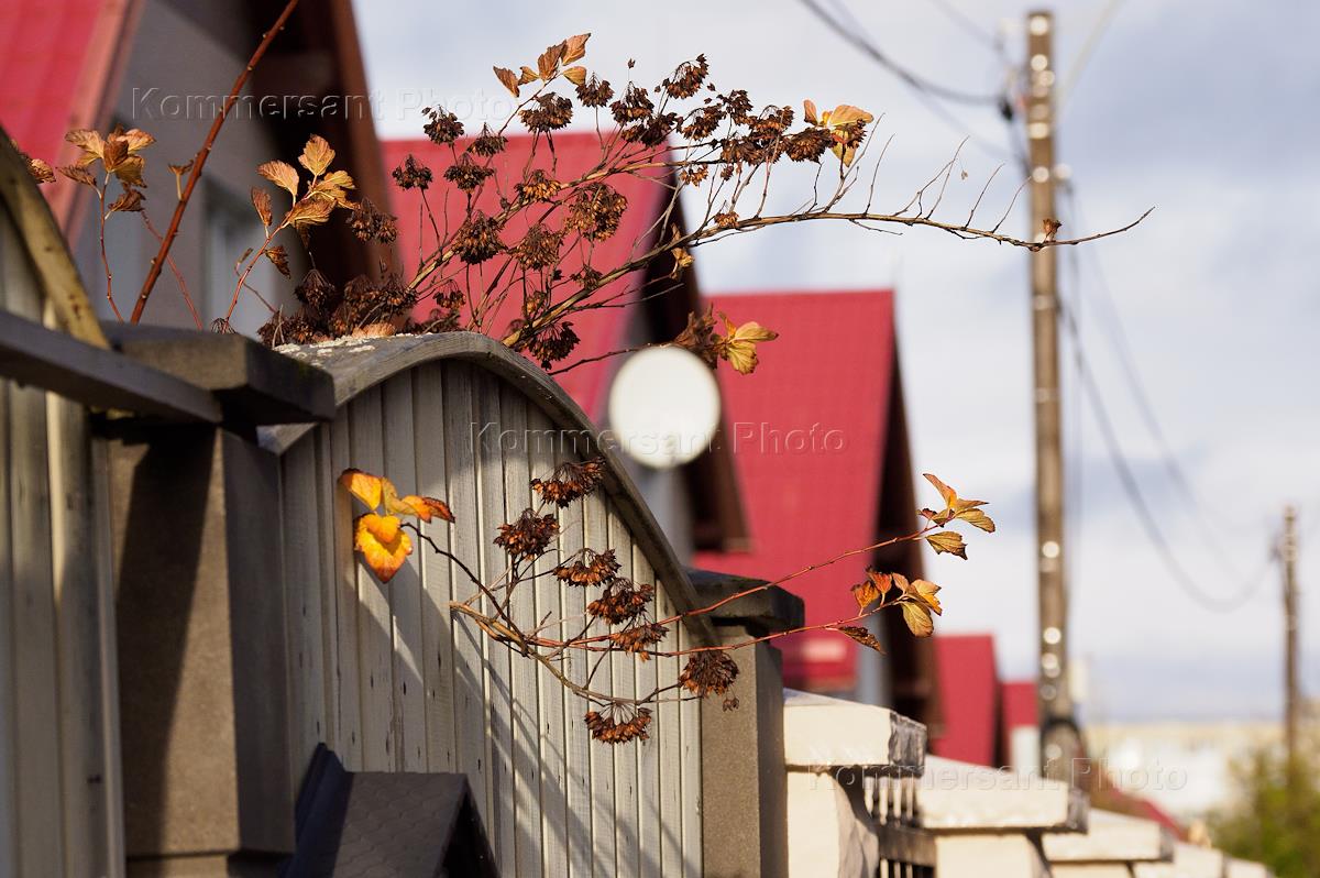 Жанровая фотография. Осень в поселке Новая Ижора. Ветка дикого винограда над забором.