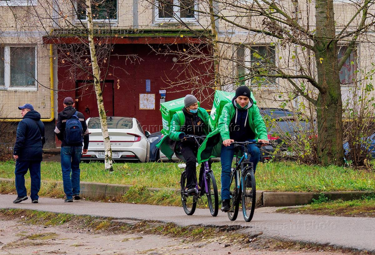 Введение ограничительных мер против распространения коронавирусной инфекции COVID-19. Жанровая фотография. Колпино. Доставщики еды на велосипедах во время выполнения заказа.