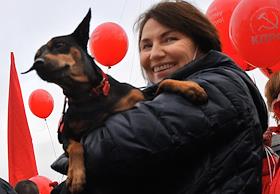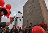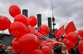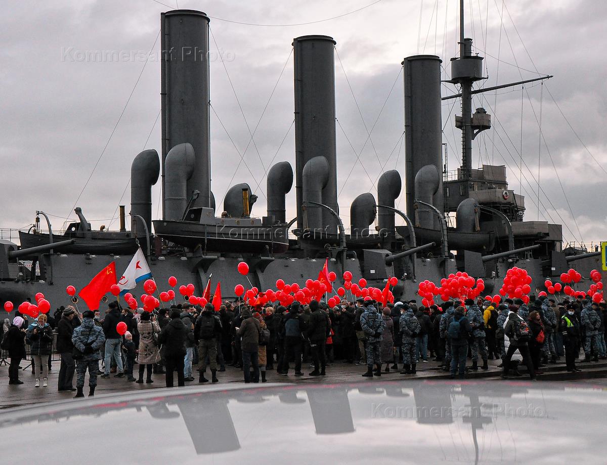 Участники Коммунистического митинга в честь 104-й годовщины Великой Октябрьской социалистической революции, организованный Коммунистической партией России (КПРФ) у крейсера "Аврора".