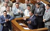 Верховная Рада Украины (ВРУ) разблокирована. Народные депутаты Партии регионов Украины (ПР) и лидер ПР Виктор Янукович (за трибуной) во время заседания ВРУ.