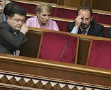Слева направо народные депутаты Украины: Петр Порошенко, фракция "Наша Украина" (НУ), лидер БЮТ Юлия Тимошенко и лидер фракции НУ Роман Бессмертный в зале заседаний Верховной Рады Украины (ВРУ).
