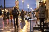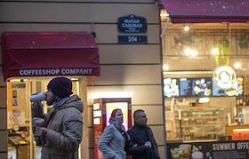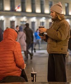 Введение ограничительных мер против распространением коронавирусной инфекции. Жанровая фотография. Мужчина пьет кофе на Малой Садовой во время закрытия ресторанов для посетителей и обслуживания в режиме "на вынос".