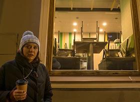 Введение ограничительных мер против распространением коронавирусной инфекции. Жанровая фотография. Девушка со стаканчиком кофе у витрины закрытого для посетителей ресторана.