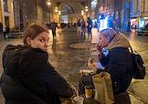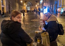 Введение ограничительных мер против распространением коронавирусной инфекции. Жанровая фотография. Девушки с заказом из ресторана быстрого питания "Макдоналдс" едят на улице.