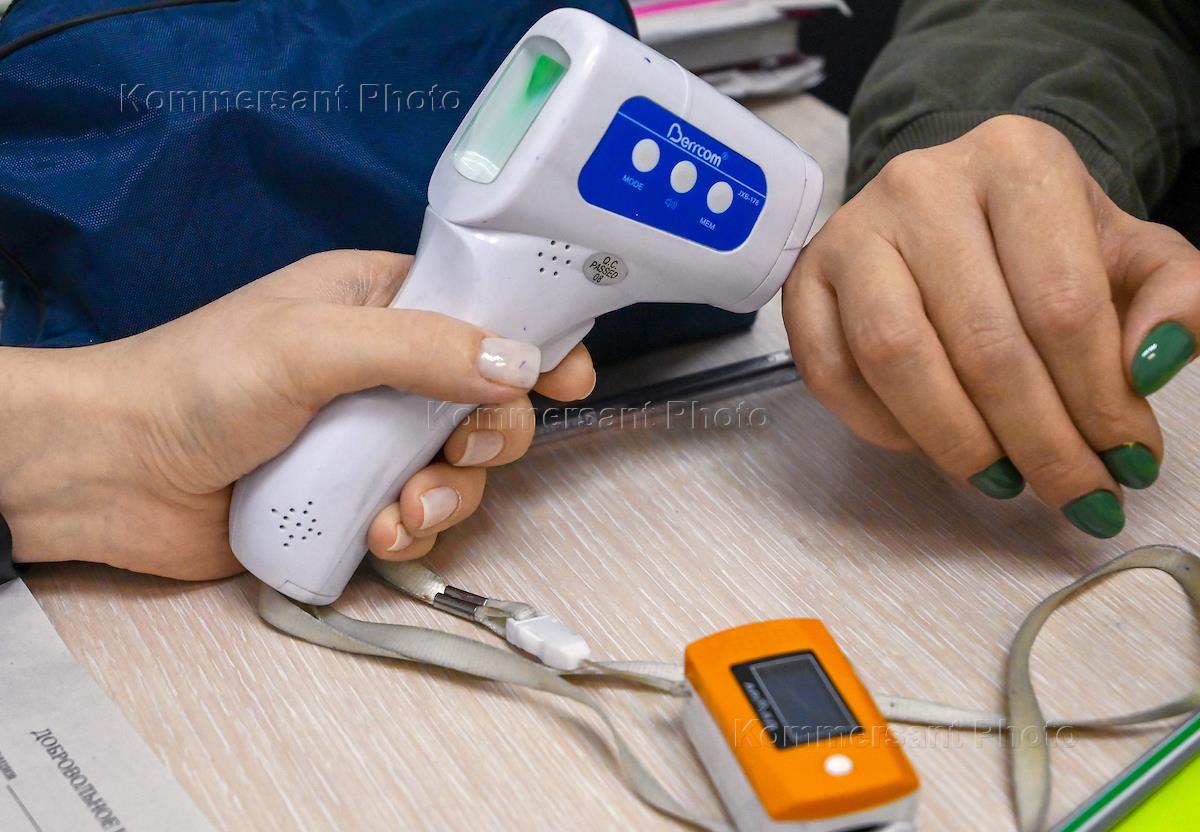 Жанровая фотография. Пункт вакцинации от коронавирусной инфекции COVID-19. Замер температуры у пациента перед вакцинацией.
