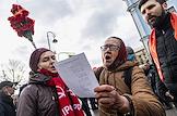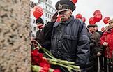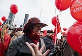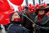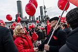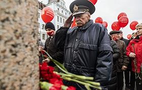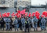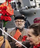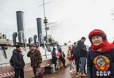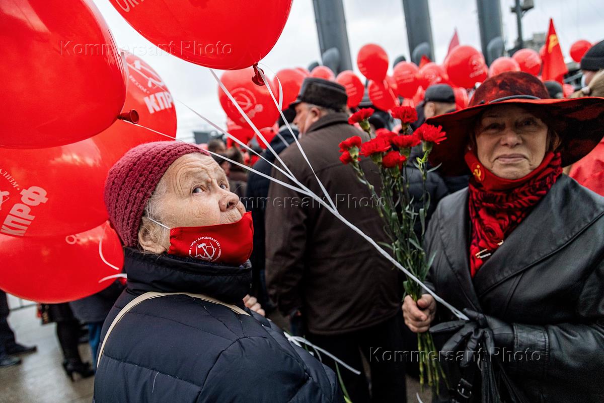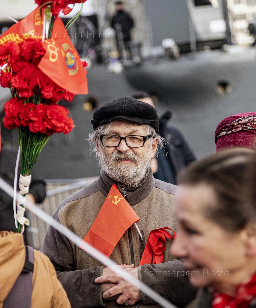 Участники Коммунистического митинга в честь 104-й годовщины Великой Октябрьской социалистической революции, организованный Коммунистической партией России (КПРФ) у крейсера "Аврора".