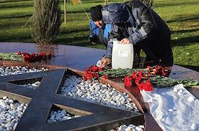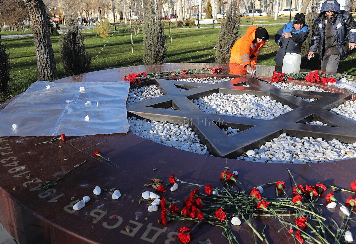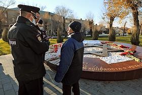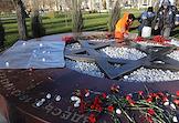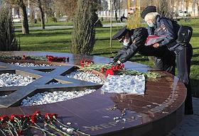 Сотрудники правоохранительных органов во время проверки по факту осквернения памятного знака в виде Звезды Давида в память о жертвах Холокоста в сквере 8 Марта.
