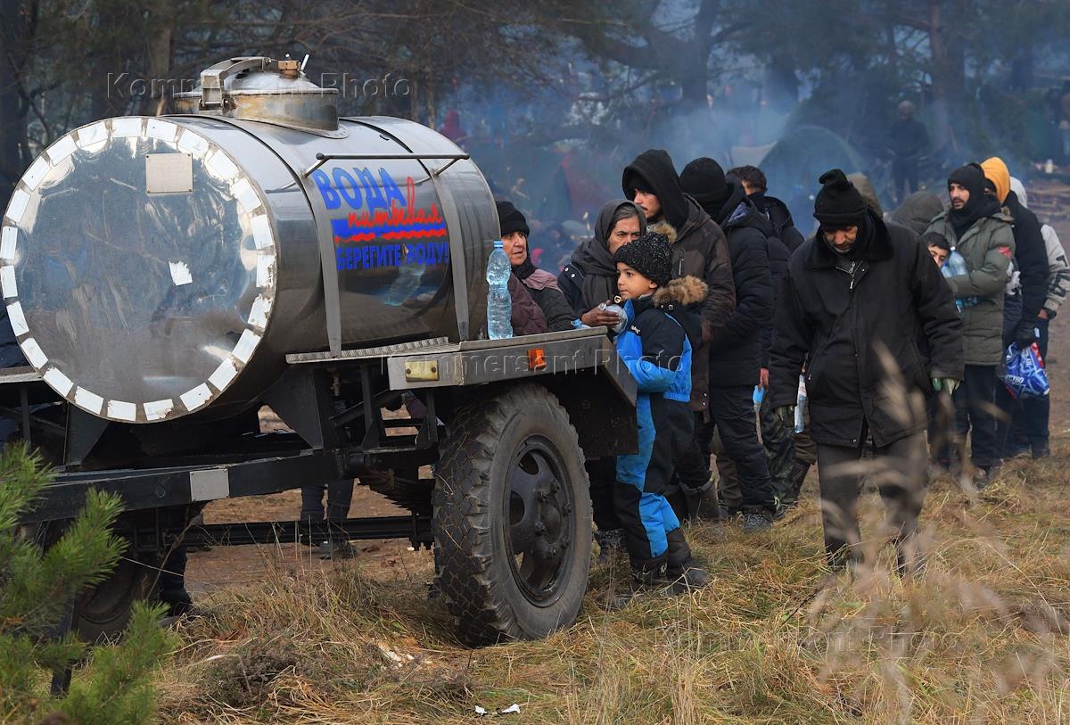 Ситуация с беженцами на белорусско-польской границе. Мигранты в очереди у бочки с питьевой водой.