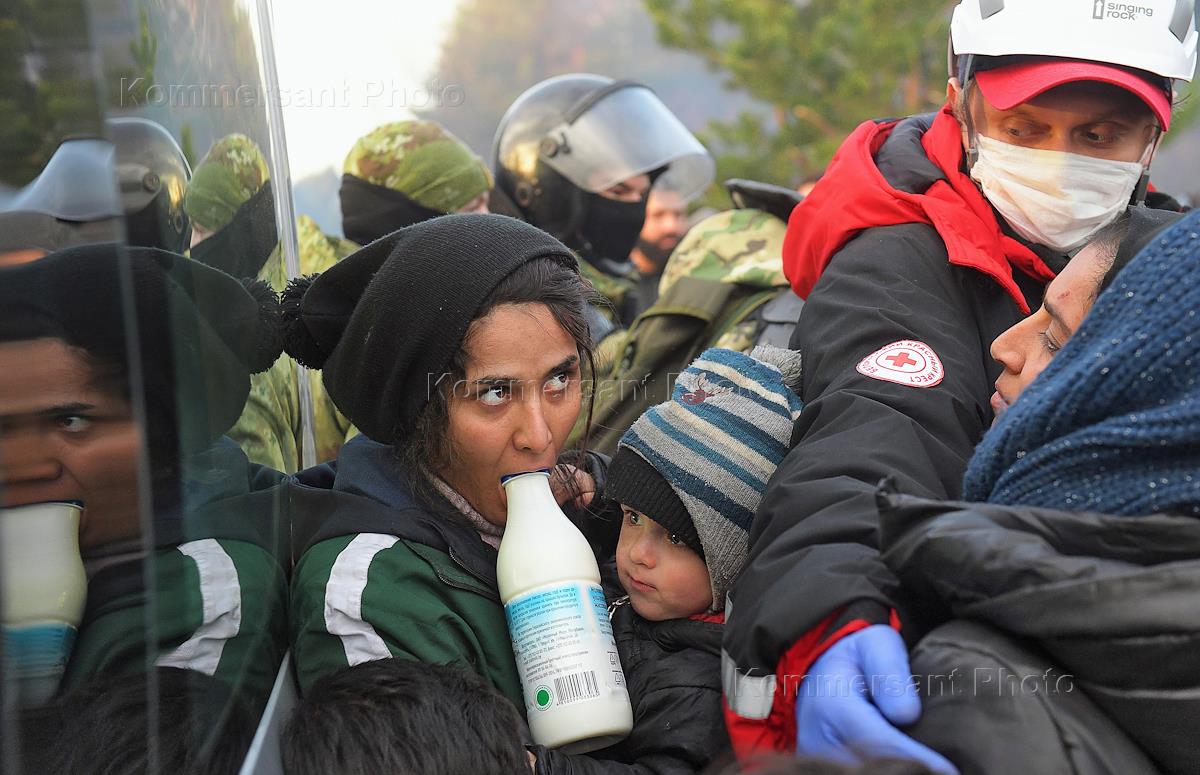 Ситуация с беженцами на белорусско-польской границе. Мигранты во время получения гуманитарной помощи с продуктами.