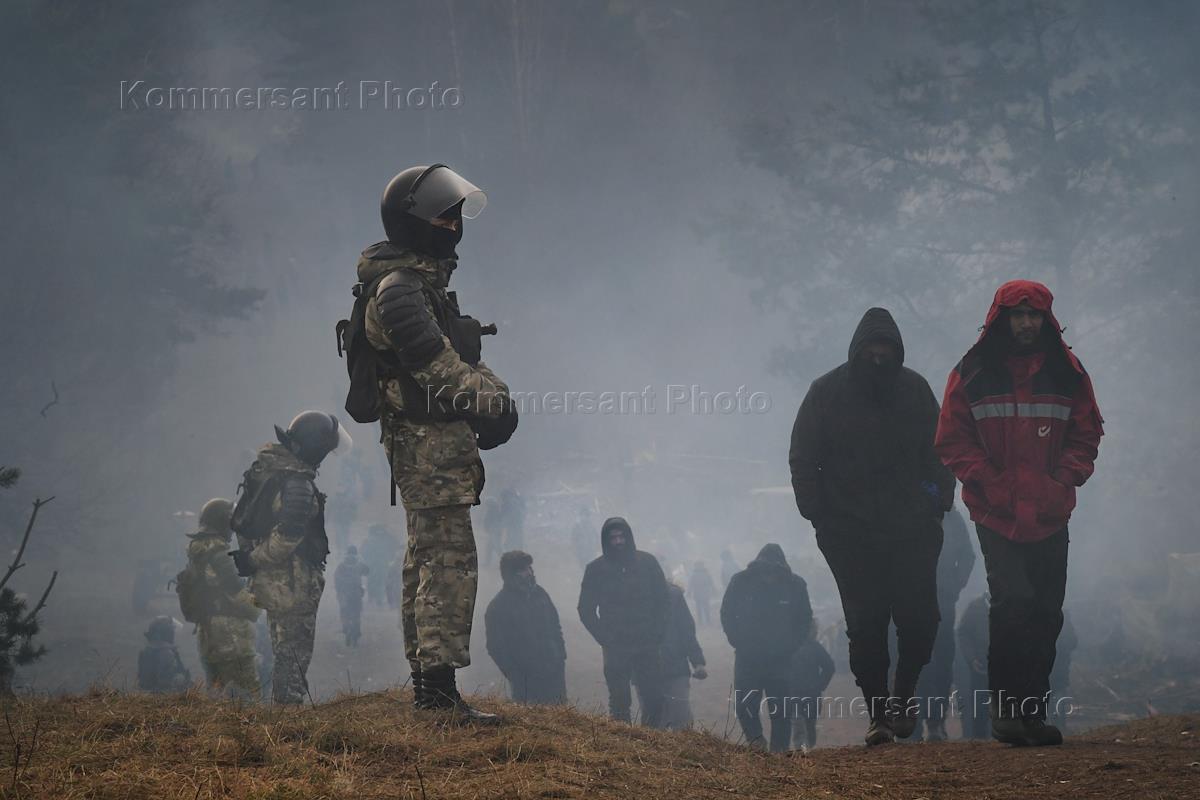 The situation with refugees on the Belarusian-Polish border. Migrants in a camp during a clash with border guards.