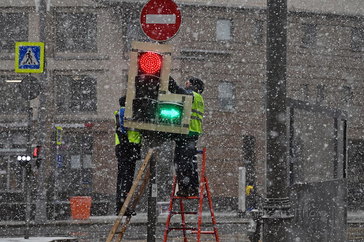 Виды Москвы во время снегопада. Жанровая фотография. Сотрудники Центра организации дорожного движения (ЦОДД) устанавливают светофор.