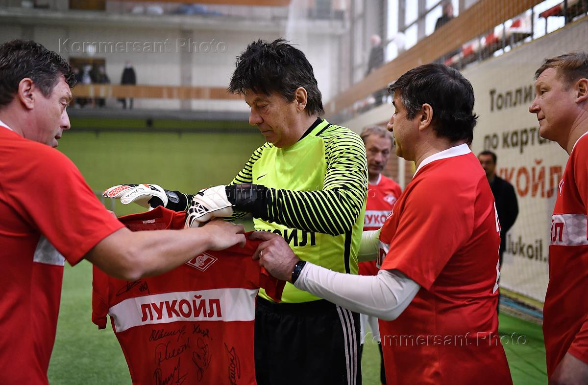 Благотворительный матч ФК "Спартак" в поддержку паллиативных пациентов столичной Центральной клинической больницы святителя Алексия. Команда врачей больницы и "золотой состав" команды "Спартак" в манеже футбольного клуба "Спартак".