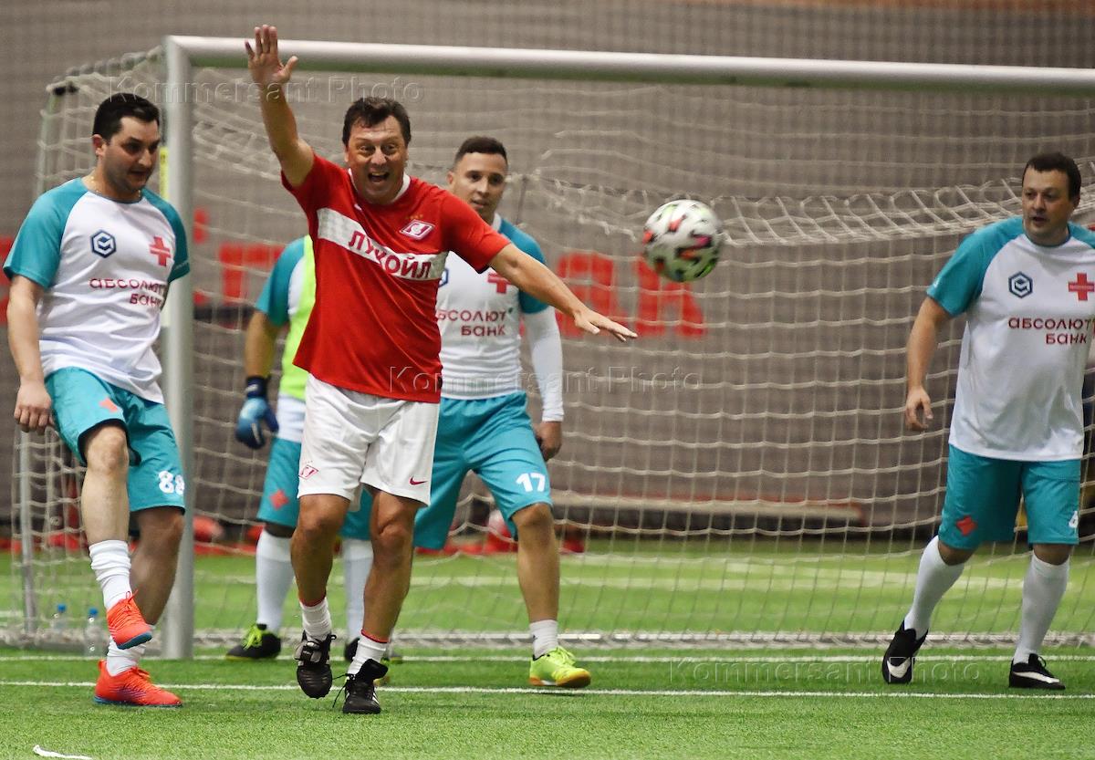 Благотворительный матч футбольного клуба (ФК) "Спартак" в поддержку паллиативных пациентов столичной Центральной клинической больницы Святителя Алексия Митрополита Московского в манеже ФК "Спартак". Ректор Академии футбола и вратарского искусства Ринат Дасаев (справа) во время матча.
