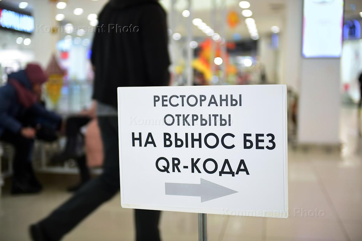 Ограничительные меры против распространения коронавирусной инфекции COVID-19. Жанровая фотография. Табличка с надписью "Рестораны открыты на вынос без QR-кода".