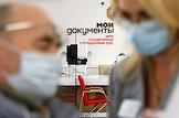 Работа многофункционального центрп "Мои Документы" в Волгограде. Жанровая фотография. Распечатка бумажного QR-кода о вакцинации от COVID-19 или перенесенном заболевании лицам пенсионного возраста.
