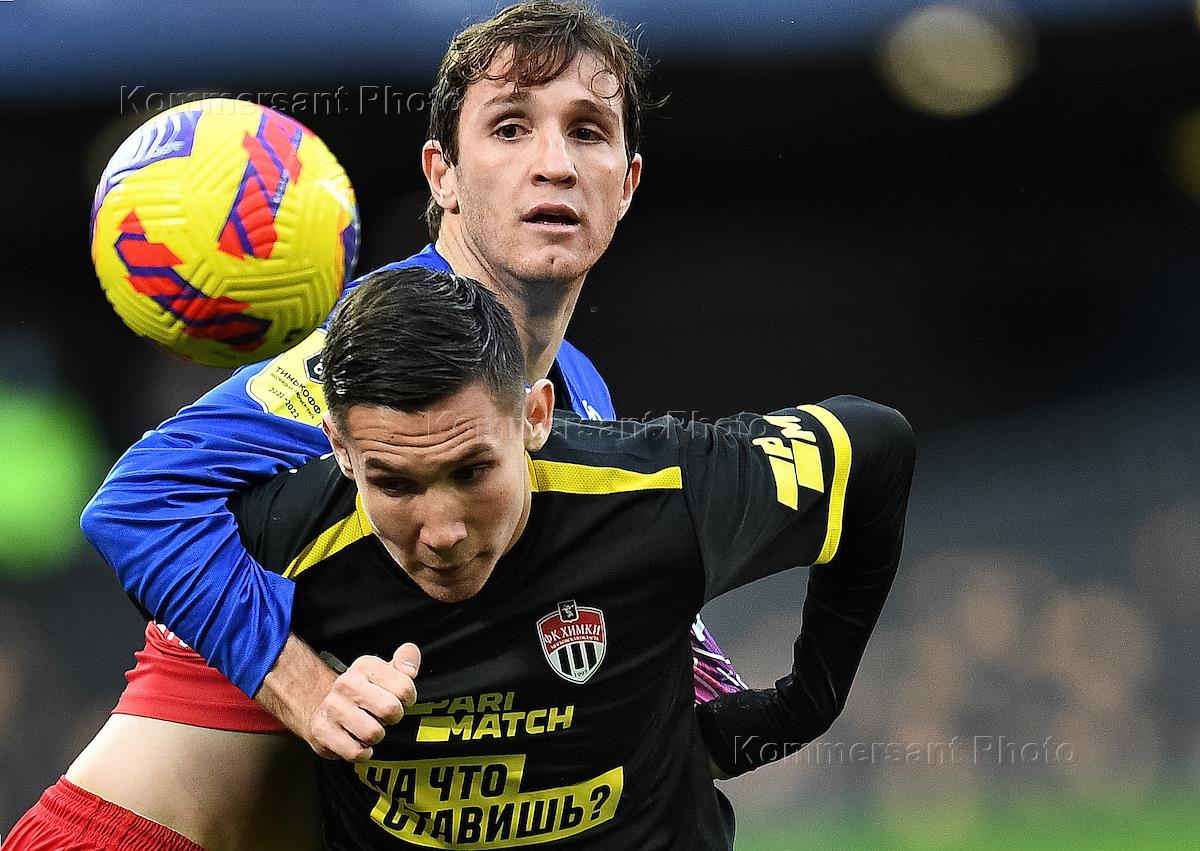 Российская Премьер-Лига (РПЛ). Тинькофф - Чемпионат России по футболу 2021/2022. 15-й тур. Матч между командами ЦСКА (Москва) - "Химки" (Химки) на стадионе "ВЭБ Арена". Игрок команды "Химки" Дмитрий Тихий (в центре) и игрок команды ЦСКА Антон Заболотный (справа) во время матча.