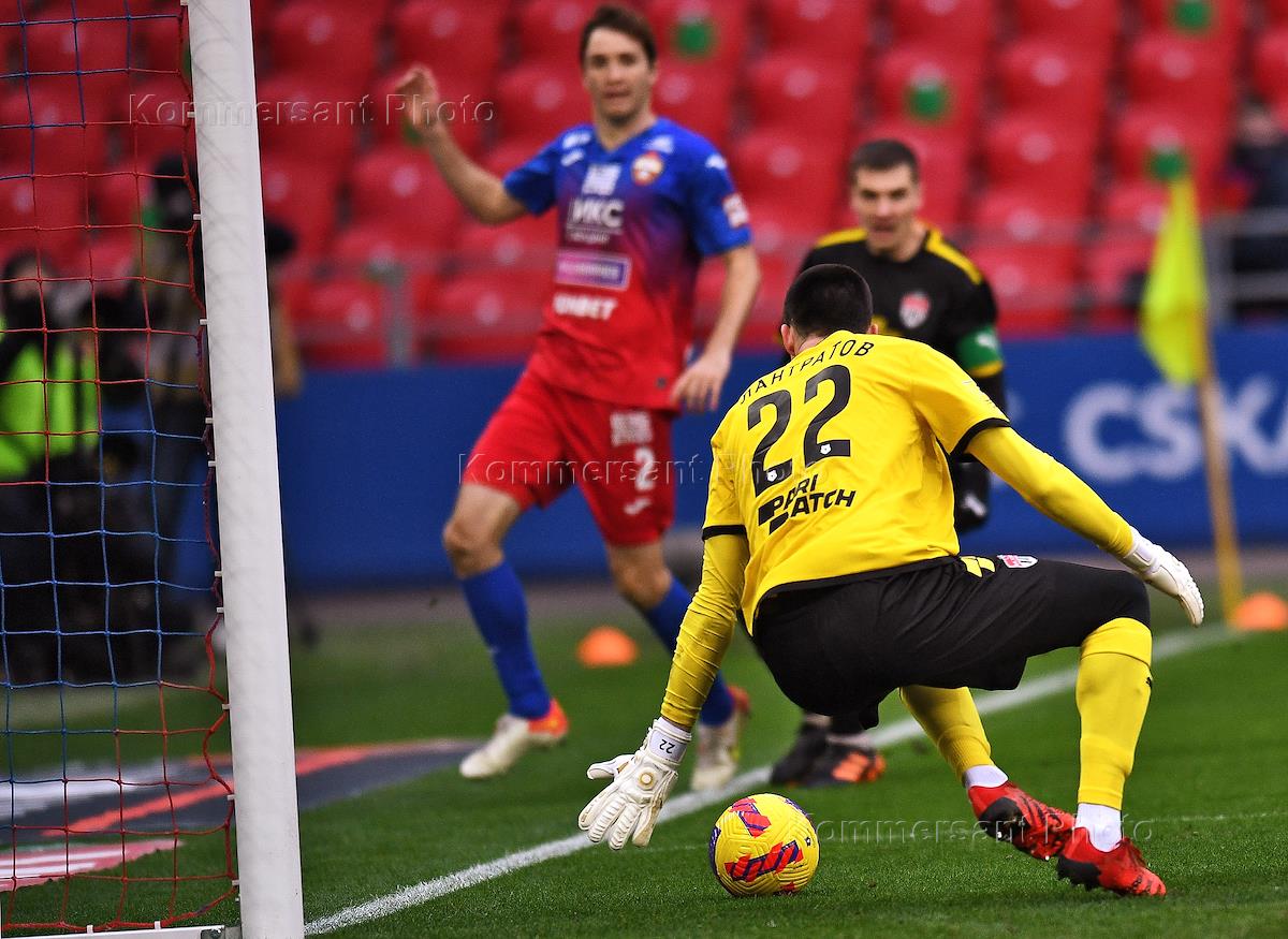 Российская Премьер-Лига (РПЛ). Тинькофф - Чемпионат России по футболу 2021/2022. 15-й тур. Матч между командами ЦСКА (Москва) - "Химки" (Химки) на стадионе "ВЭБ Арена". Вратарь команды "Химки"Илья Лантратов во время матча.
