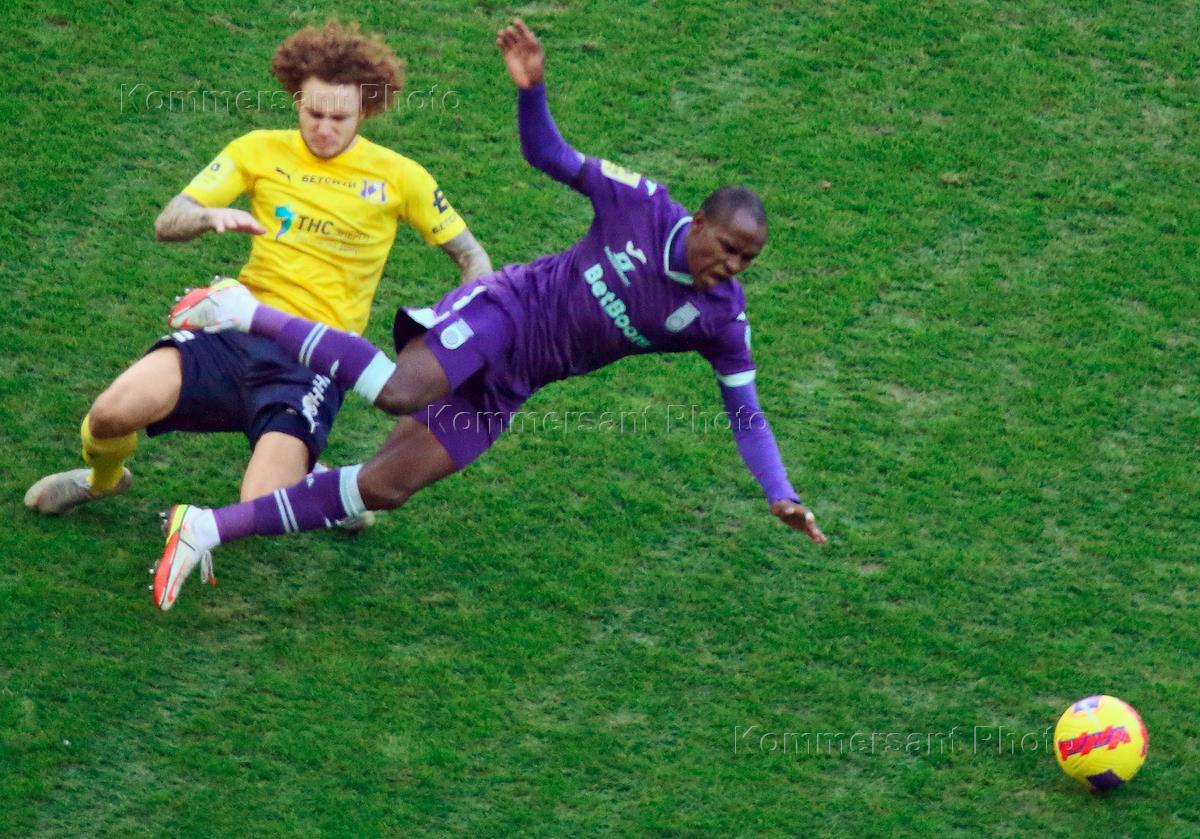 Russian Premier League (RPL). Tinkoff - Russian Football Championship 2021/2022. 15th round. A match between the teams Rostov (Rostov-on-Don) - Ufa (Ufa) at the Rostov Arena stadium. Ufa player Egash Kasintura (left) and Rostov team player Pontus Almqvist (right) during a match.