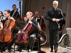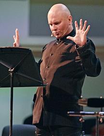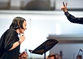 Совместный проект Московской филармонии, ММОМА и Aksenov Family Foundation "Русская музыка 2.1". Мировые премьеры произведений композиторов-лауреатов в Концертном зале имени П.И.Чайковского. Дирижер Федор Леднёв во время концерта.