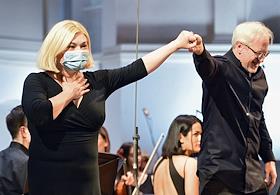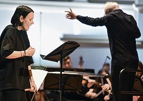 Совместный проект Московской филармонии, ММОМА и Aksenov Family Foundation "Русская музыка 2.1". Мировые премьеры произведений композиторов-лауреатов в Концертном зале имени П.И.Чайковского. Дирижер Федор Леднёв (справа) и оперная певица Арина Зверева (слева) во время концерта.