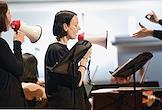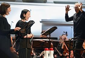 Совместный проект Московской филармонии, ММОМА и Aksenov Family Foundation "Русская музыка 2.1". Мировые премьеры произведений композиторов-лауреатов в Концертном зале имени П.И.Чайковского. Справа налево: дирижер Федор Леднёв, оперные певицы Арина Зверева и Ольга Россини во время концерта.