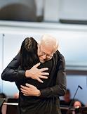 Совместный проект Московской филармонии, ММОМА и Aksenov Family Foundation "Русская музыка 2.1". Мировые премьеры произведений композиторов-лауреатов в Концертном зале имени П.И.Чайковского. Дирижер Федор Леднёв (справа) и композитор Александра Филоненко (слева) во время концерта.