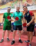 Турнир по настольному теннису "Уральская шляпа". Слева направо: глава Сысертского городского округа Дмитрий Нисковских, мэр Екатеринбурга Алексей Орлов, автогонщик Сергей Карякин на турнире.
