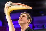 Повседневная жизнь российских цирков. Жанровая фотография. Артист Тверского государственного цирка, дрессировщик Владимир Лекарев со своим дрессированным пеликаном за кулисами цирка.