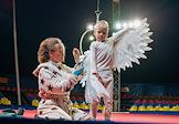 Повседневная жизнь российских цирков. Жанровая фотография. Волгоградский Цирк - Шапито. Воздушная гимнастка вместе с сыном репетируют на манеже цирка.