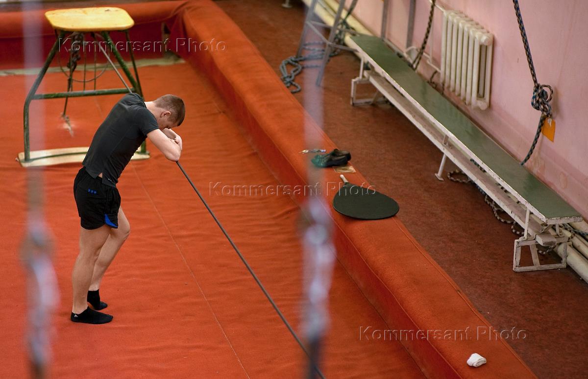 Повседневная жизнь российских цирков. Жанровая фотография. Волгоградский Цирк - Шапито. Воздушная гимнастка и ее сын репетируют номер.