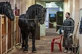 Повседневная жизнь российских цирков. Жанровая фотография. Сотрудник Тверского государственного цирка в цирковой конюшне рядом с лошадями.