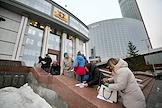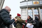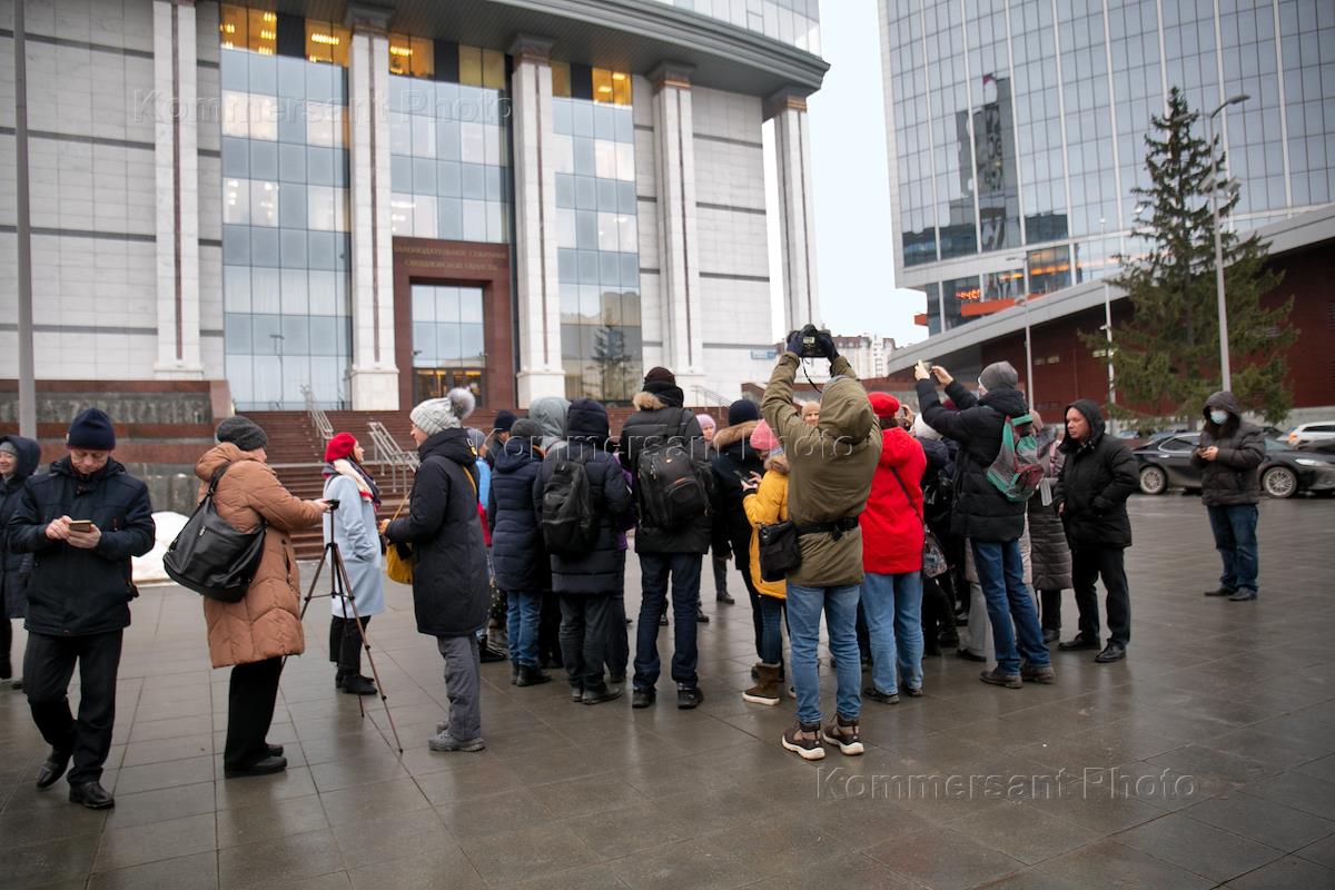 Акция протеста против введения QR-кодов у здания законодательного собрания Свердловской области. Участники во время акции.