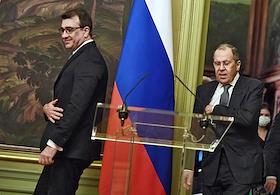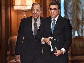 Министр иностранных дел России Сергей Лавров (слева) и министр иностранных дел Бразилии Карлус Алберту Франку Франса (справа) перед началом переговоров в Доме приемов МИД России.