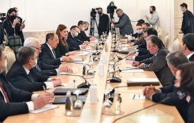 Министр иностранных дел России Сергей Лавров (третий слева) во время переговоров с министром иностранных дел Бразилии Карлушем Алберту Франко Франсой в Доме приемов МИД России.