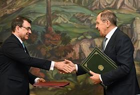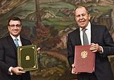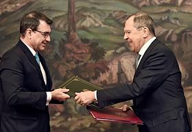 Министр иностранных дел России Сергей Лавров (справа) и министр иностранных дел Бразилии Карлус Алберту Франку Франса (слева) во время церемония подписания совместных документов по итогам переговоров в Доме приемов МИД России.