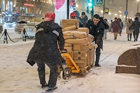 Виды Санкт-Петербурга. Снегопад в городе. Жанровая фотография. Мужчины везут на тележке коробки с товаром.