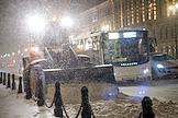 Виды Санкт-Петербурга. Снегопад в городе. Трактор коммунальной службы города во время уборки снега с автомобильной части улицы.