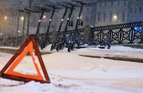 Виды Санкт-Петербурга. Снегопад в городе. Парковка проката электросамокатов под снегом.