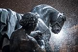 Виды Санкт-Петербурга. Снегопад в городе. Скульптура "Укрощение коня" Клодта на Аничков мосту реку Фонтанку.