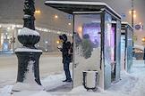 Виды Санкт-Петербурга. Снегопад в городе. Люди на заснеженной остановке городского транспорта.
