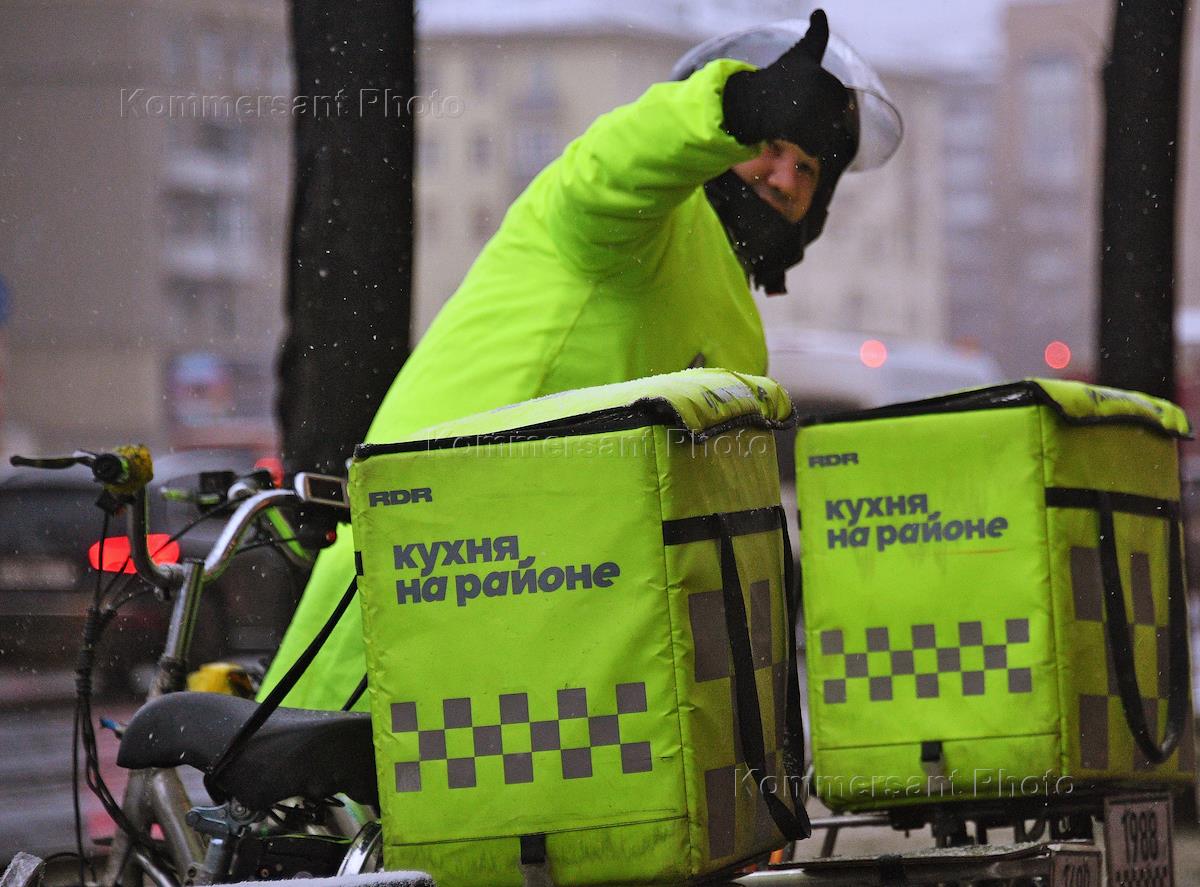 Жанровая фотография. Снегопад с дождем в городе. Курьер службы доставки еды "Кухня на районе" .