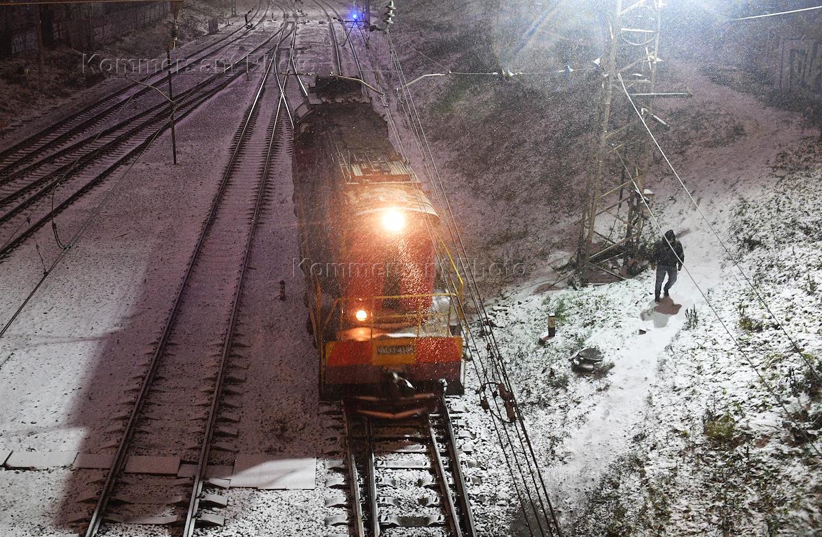Виды Москвы во время снегопада. Жанровая фотография. Пригородный поезд на Ярославском железнодорожном вокзале.